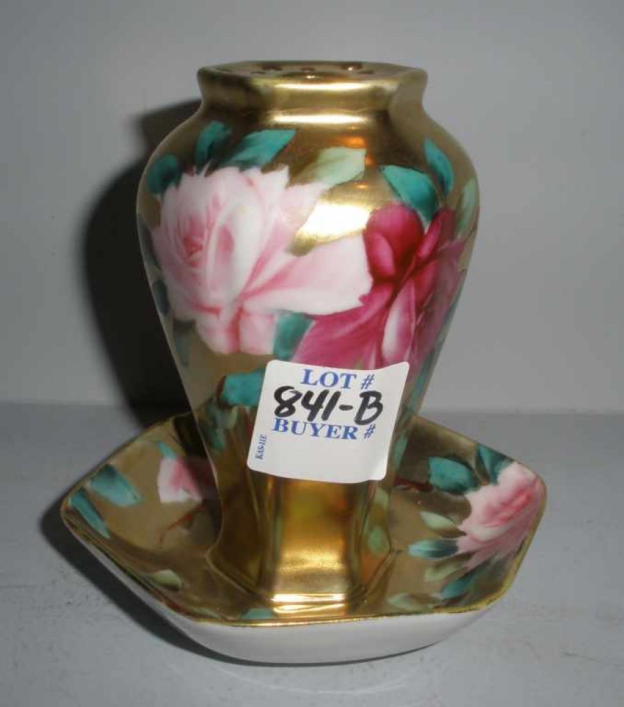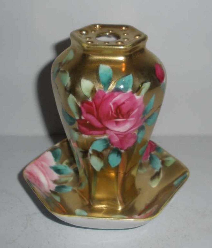 Nippon 4" tall hat pin holder with attached ring tray. Nippon 4" tall hat pin holder with attached ring tray.