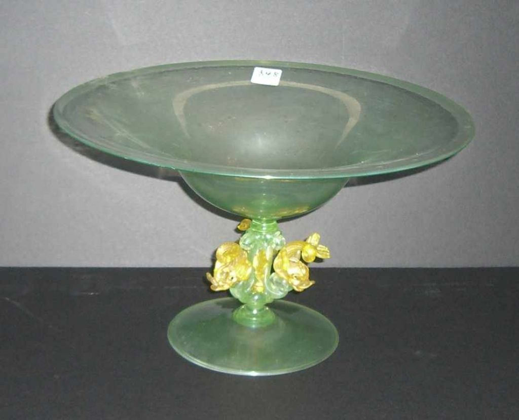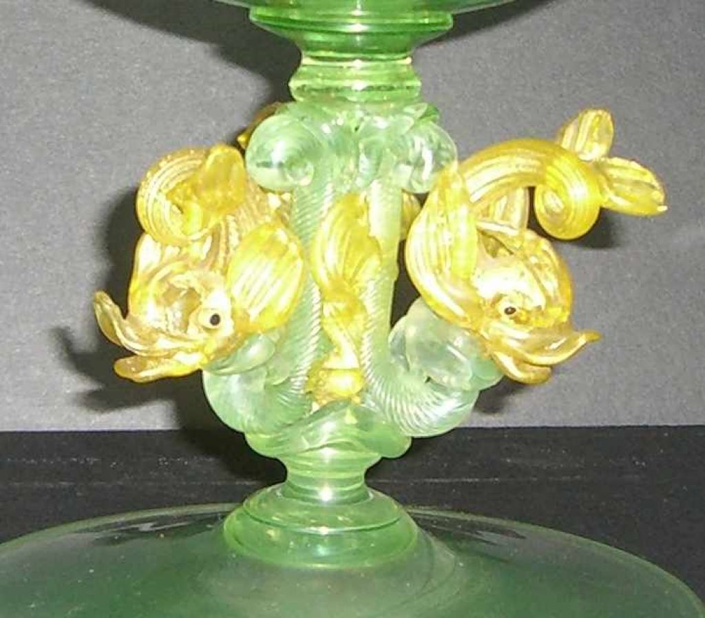 Venetian glass compote with 3 dolphins on pedestal base - 13 1/2" round by 8" tall Venetian glass compote with 3 dolphins on pedestal base - 13 1/2" round by 8" tall