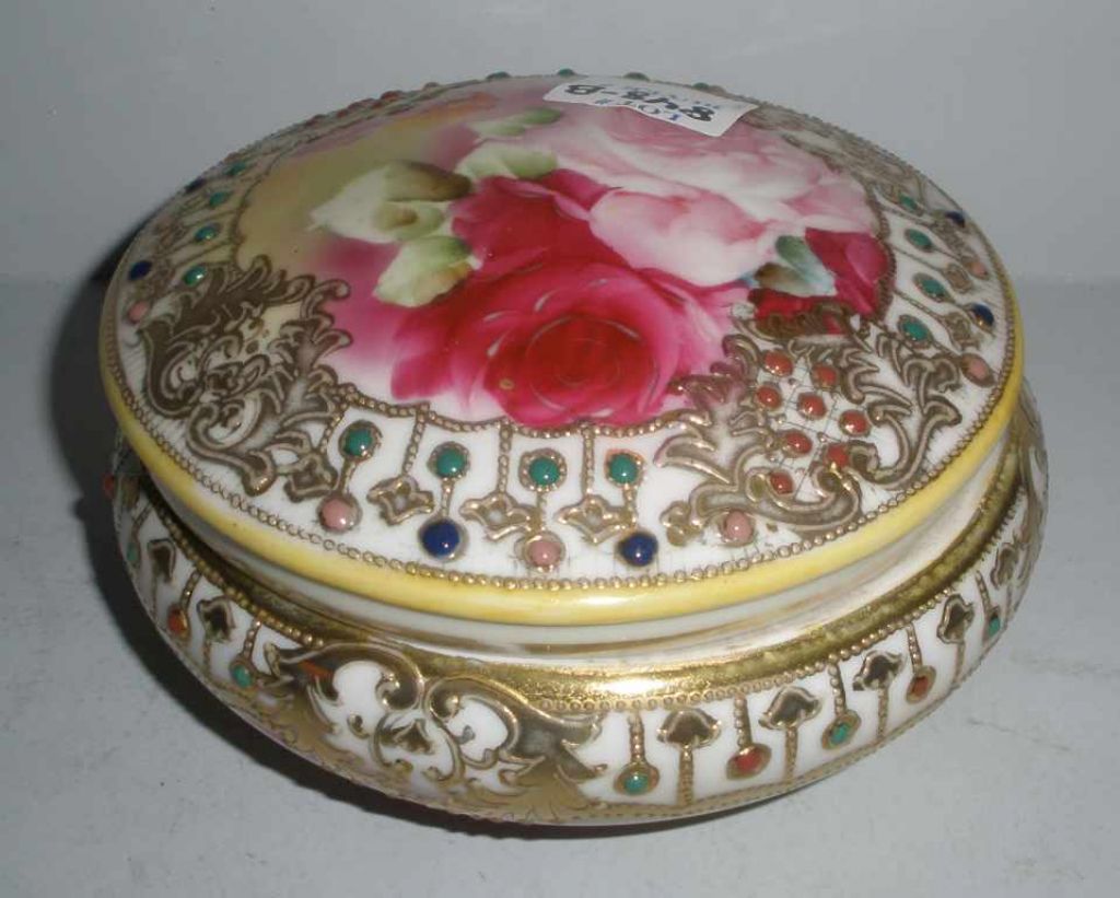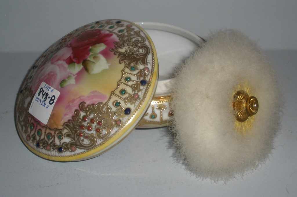 Nippon covered 5" round jeweled powder jar with puff. Nippon covered 5" round jeweled powder jar with puff.