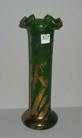 Green & gold enameled ruffled top vase - 4" round by 13 1/2" tall Green & gold enameled ruffled top vase - 4" round by 13 1/2" tall