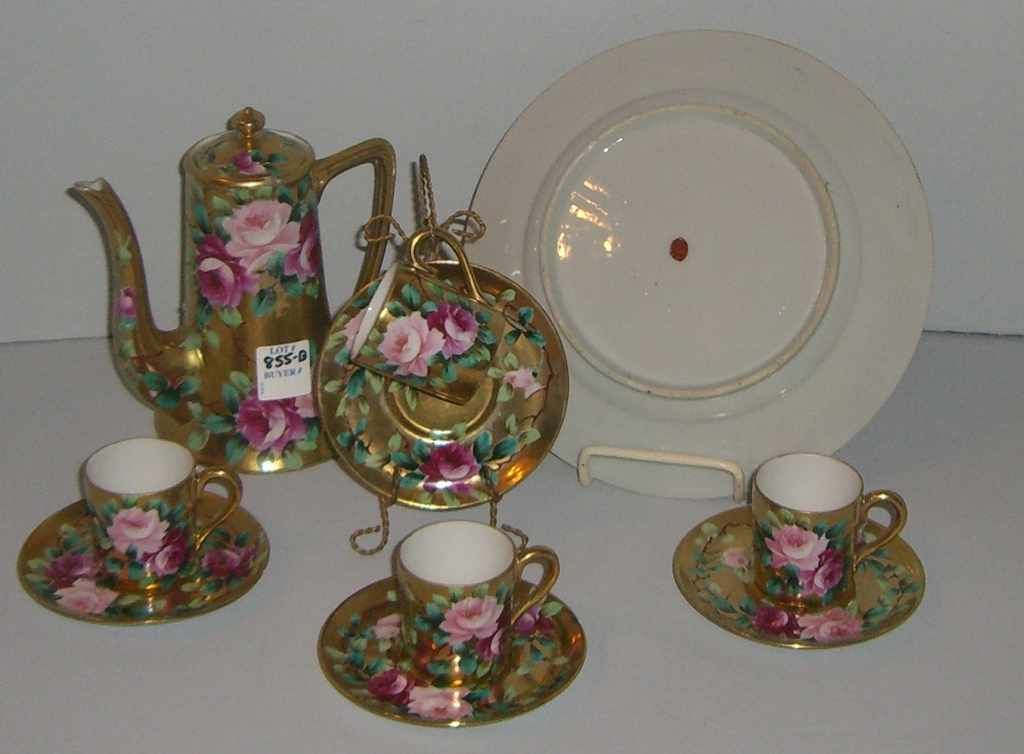 Nippon demi coffee pot with 4 cups & saucers & plate gold with roses Nippon demi coffee pot with 4 cups & saucers & plate gold with roses
