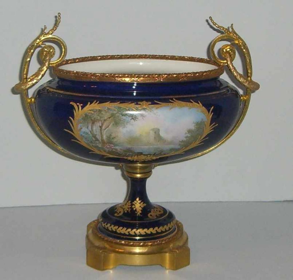 Oval cobalt center piece with gilded bronze portrait medallion. 7 1/2" width x 12" length x 11 1/2" height Oval cobalt center piece with gilded bronze portrait medallion. 7 1/2" width x 12" length x 11 1/2" height
