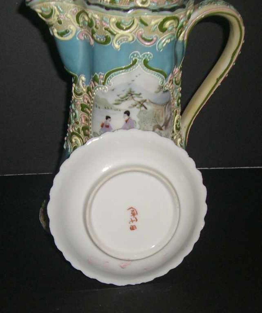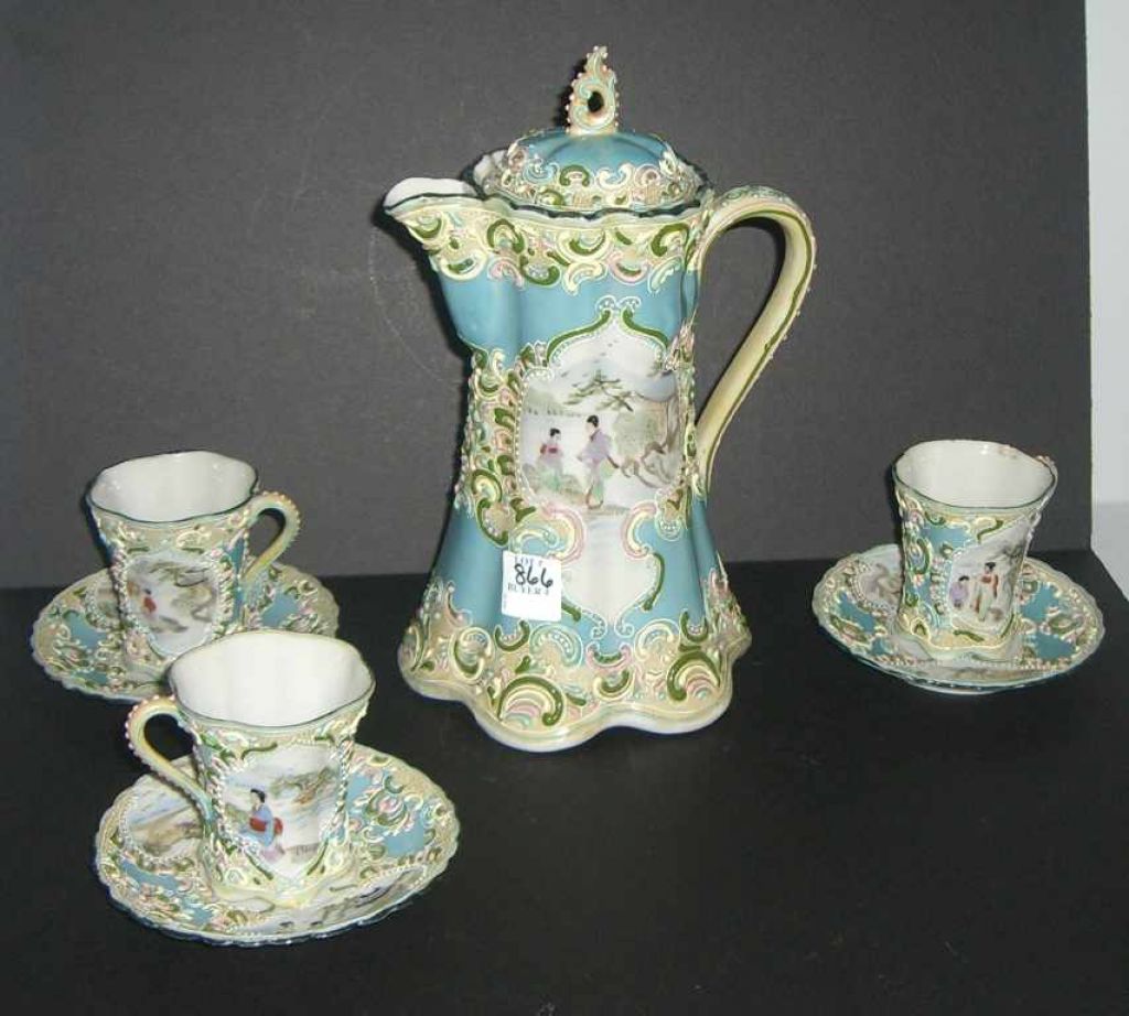 7 Piece oriental enameled coffee set - coffee pot, 3 cups, 3 saucers 7 Piece oriental enameled coffee set - coffee pot, 3 cups, 3 saucers