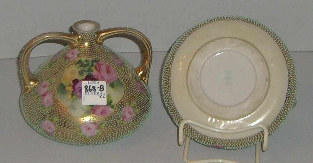 Nippon pair of 4" tall double handle vases aqua beading gold & rose d Nippon pair of 4" tall double handle vases aqua beading gold & rose d
