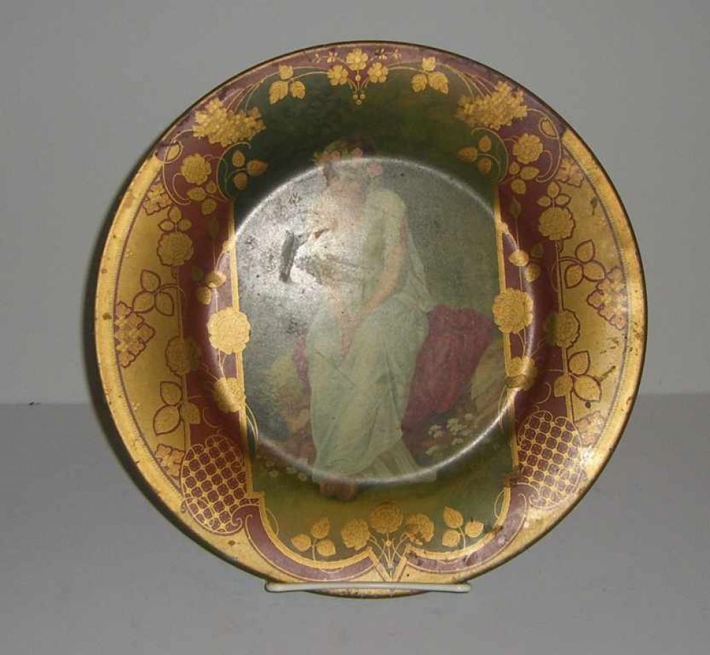 Royal Saxony art plate metal lady with roses - marked Royal Saxony art plate NO L03-IN Gedanken produced exclusively by the Chas W Shonk Co. - 10" round Royal Saxony art plate metal lady with roses - marked Royal Saxony art plate NO L03-IN Gedanken produced exclusively by the Chas W Shonk Co. - 10" round