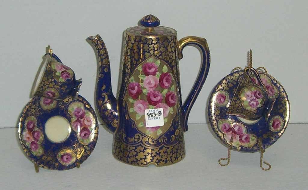 Nippon demi tea pot with 2 cups & saucers cobalt with gilt & floral. Nippon demi tea pot with 2 cups & saucers cobalt with gilt & floral.