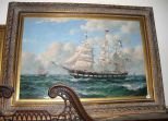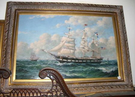 Large oil on canvas brown frame ship - 44 1/2" wide by 33" high Large oil on canvas brown frame ship - 44 1/2" wide by 33" high