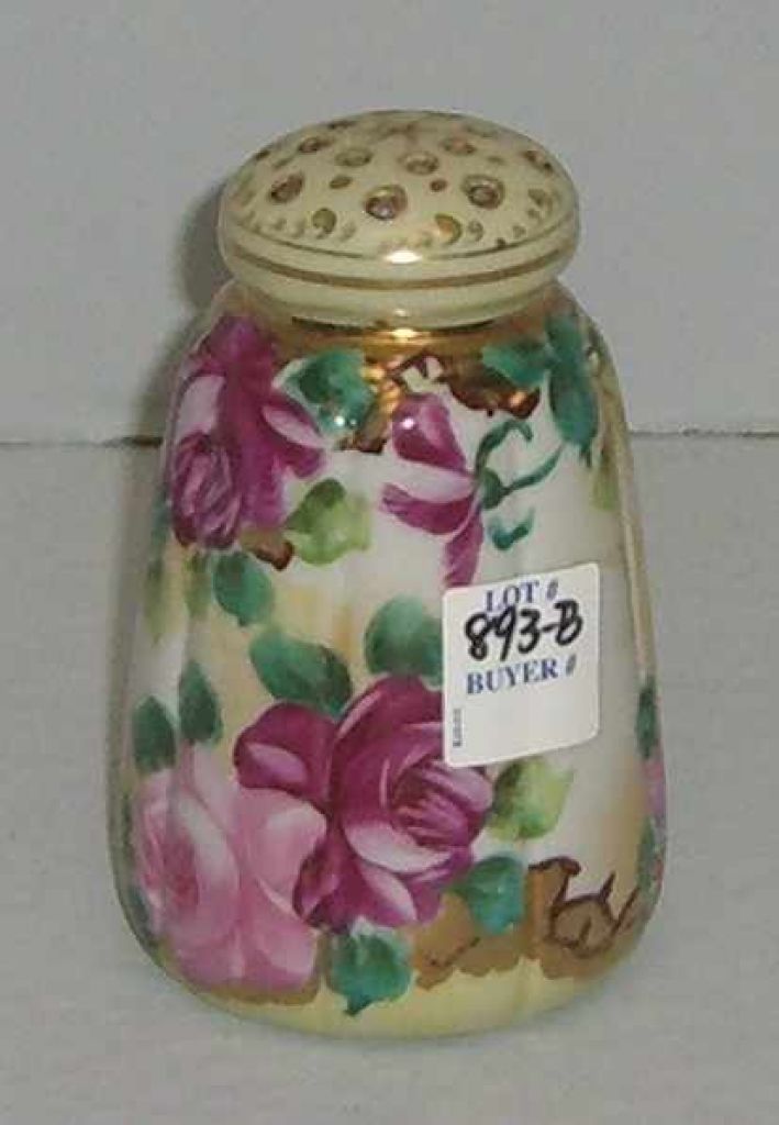 Nippon muffin ewer "sugar shaker" gold with multi color roses. Nippon muffin ewer "sugar shaker" gold with multi color roses.