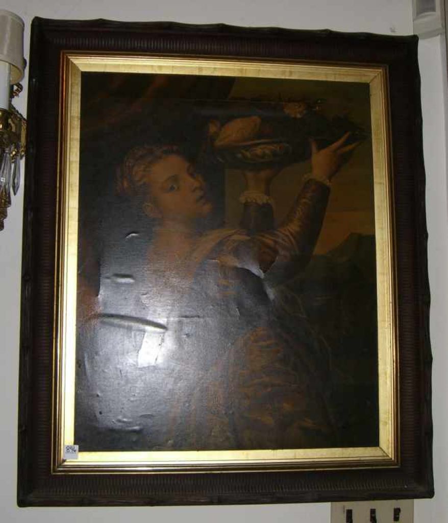 Victorian carved wooden with gilded insert frame. print of lady with fruit basket - frame is 35" tall by 30" wide Victorian carved wooden with gilded insert frame. print of lady with fruit basket - frame is 35" tall by 30" wide