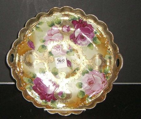 Unmarked Nippon double handle plate gold with pink flowers - 10" round Unmarked Nippon double handle plate gold with pink flowers - 10" round