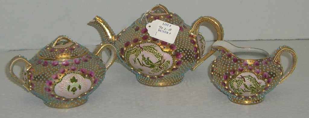 Nippon 3 pc tea set. Tea pot, creamer, & sugar with aqua raised beading. Nippon 3 pc tea set. Tea pot, creamer, & sugar with aqua raised beading.