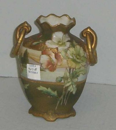 Nippon double handle vase pretzel handle gilt border lake background. Nippon double handle vase pretzel handle gilt border lake background.