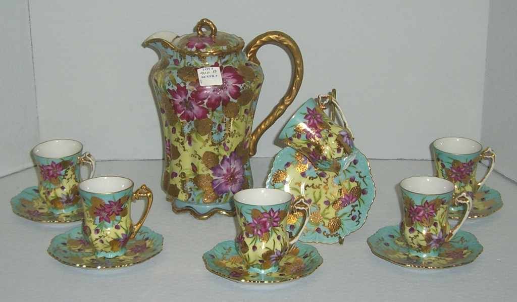 Nippon chocolate pot with 6 cups & saucers. Poppies in heavy gold gilt. Nippon chocolate pot with 6 cups & saucers. Poppies in heavy gold gilt.