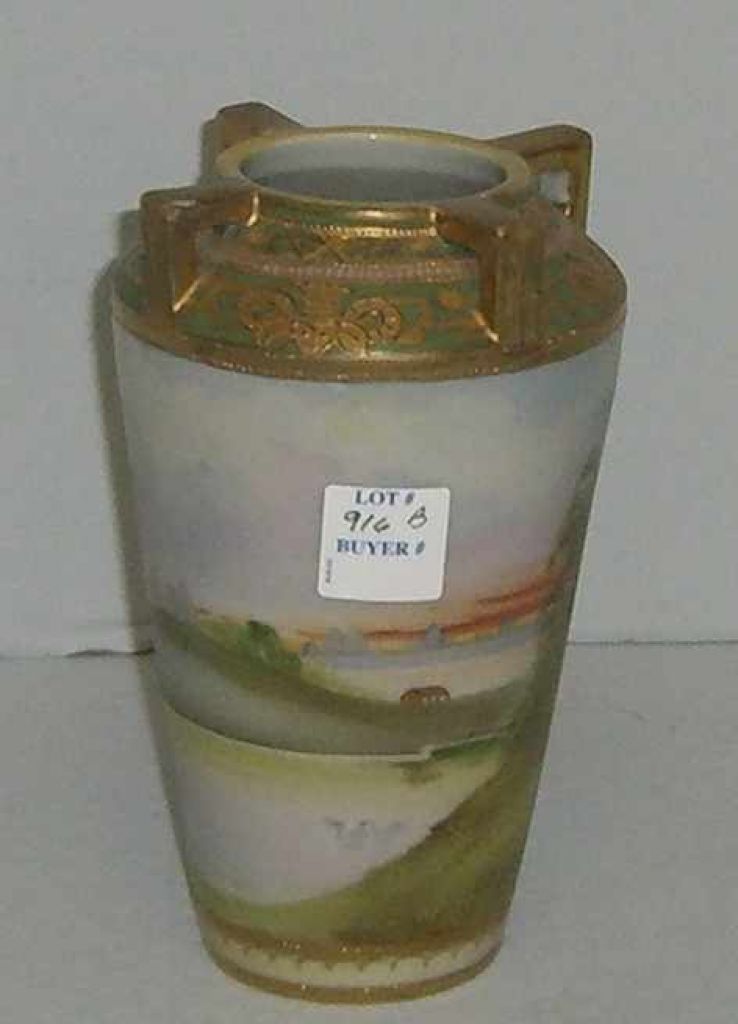 Nippon 4 handle vase with lake overlook scene - 7" tall Nippon 4 handle vase with lake overlook scene - 7" tall