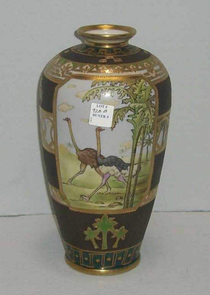 Nippon vase 12" tall with ostrich & desert scene shades of brown & green. Nippon vase 12" tall with ostrich & desert scene shades of brown & green.