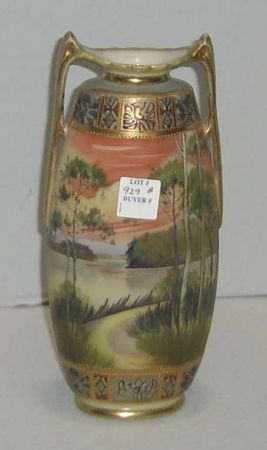 Nippon double handle vase with lake scene gold trim oval shaped Nippon double handle vase with lake scene gold trim oval shaped