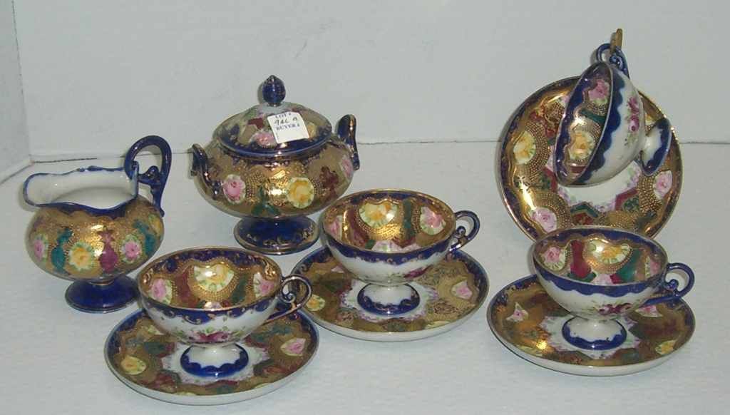 Nippon creamer & sugar with 4 cups & saucers. Cobalt & gold. Nippon creamer & sugar with 4 cups & saucers. Cobalt & gold.