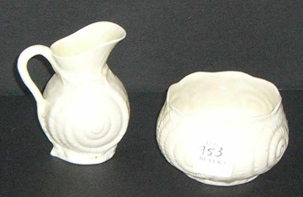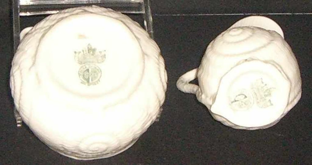 Belleek cream and sugar marked with 1st green mark Cir. 1946-1955, shell pattern. Belleek cream and sugar marked with 1st green mark Cir. 1946-1955, shell pattern.