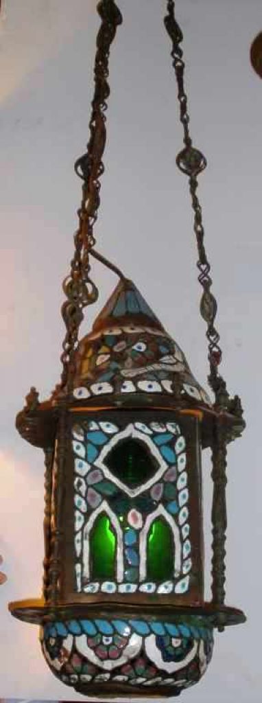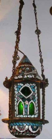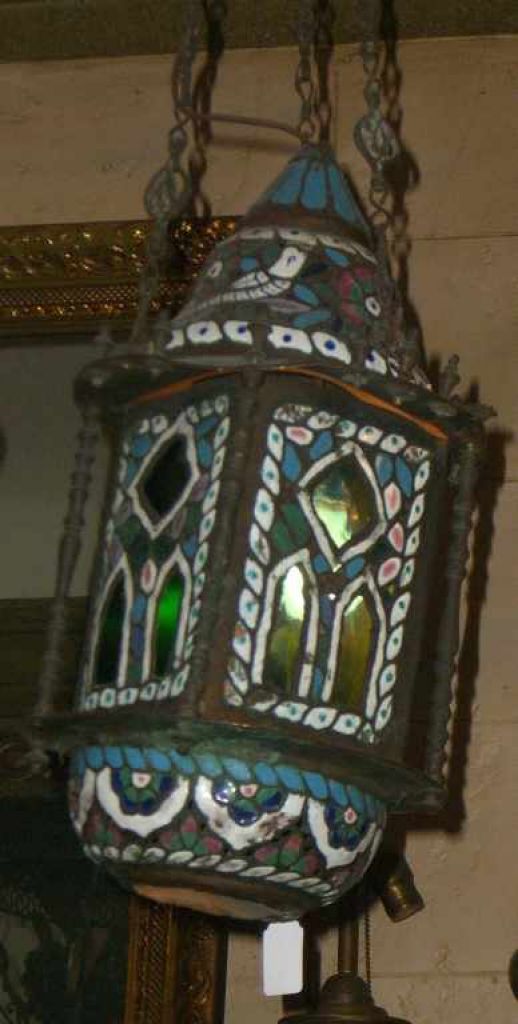 Folk Art Hanging Light Fixture w/Bright Colored Enameling and Multi-color Glass Panes - 36" tall Folk Art Hanging Light Fixture w/Bright Colored Enameling and Multi-color Glass Panes - 36" tall