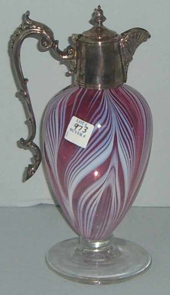 Decanter cranberry w/white decoration and silverplate mounting - 11 1/2" tall Decanter cranberry w/white decoration and silverplate mounting - 11 1/2" tall