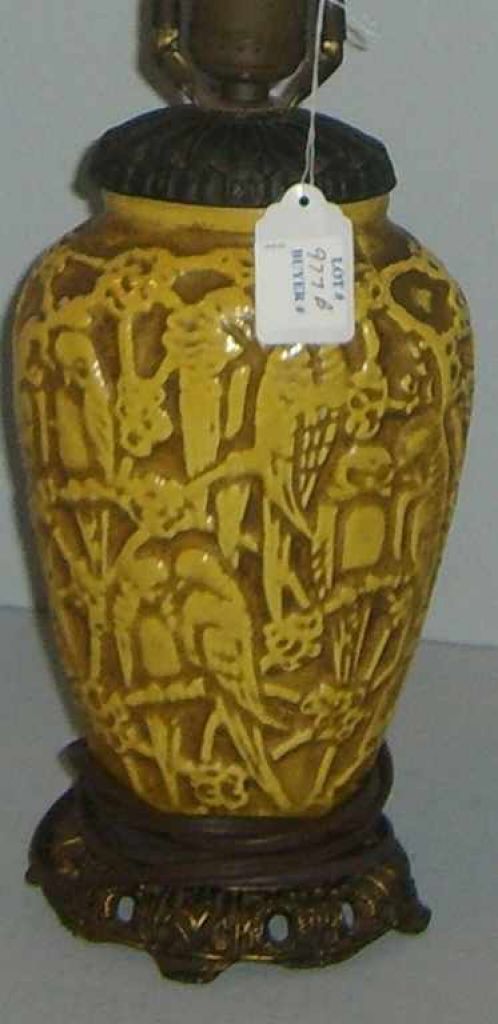 Muncie Pottery Yellow Lamp with Love Birds. 21" tall Muncie Pottery Yellow Lamp with Love Birds. 21" tall