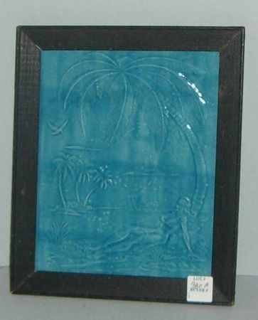 Framed Rookwood Plaque, Aqua Color w/Lady Reclining Against Palm Tree, Signed on Back, Flames Above Reverse "R" and "P" and IV and VII - 9 1/4" x 11 1/8" Framed Rookwood Plaque, Aqua Color w/Lady Reclining Against Palm Tree, Signed on Back, Flames Above Reverse "R" and "P" and IV and VII - 9 1/4" x 11 1/8"