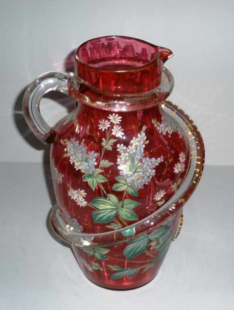 Signed Moser tankard cranberry glass w/clear glass snakes forming handle, hand painted - 13" tall - (has fitted box). Signed Moser tankard cranberry glass w/clear glass snakes forming handle, hand painted - 13" tall - (has fitted box).