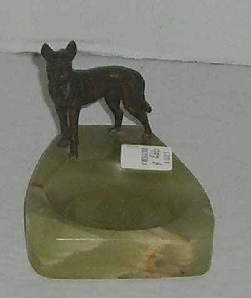 Green Onyx Ashtray w/Applied Bronze Dog Standing on Rear - 4 3/4" length x 3 1/2" width Green Onyx Ashtray w/Applied Bronze Dog Standing on Rear - 4 3/4" length x 3 1/2" width