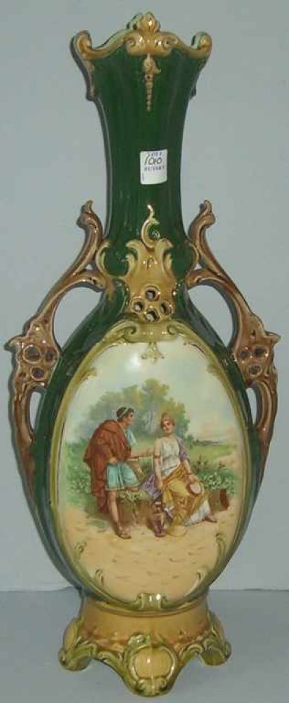 Double handled Majolica like vase, portrait front, green background, tan handles and base - 21 1/2" tall Double handled Majolica like vase, portrait front, green background, tan handles and base - 21 1/2" tall