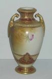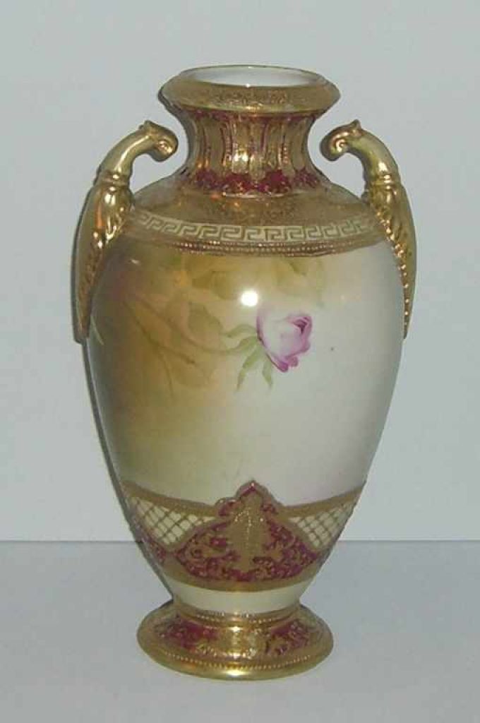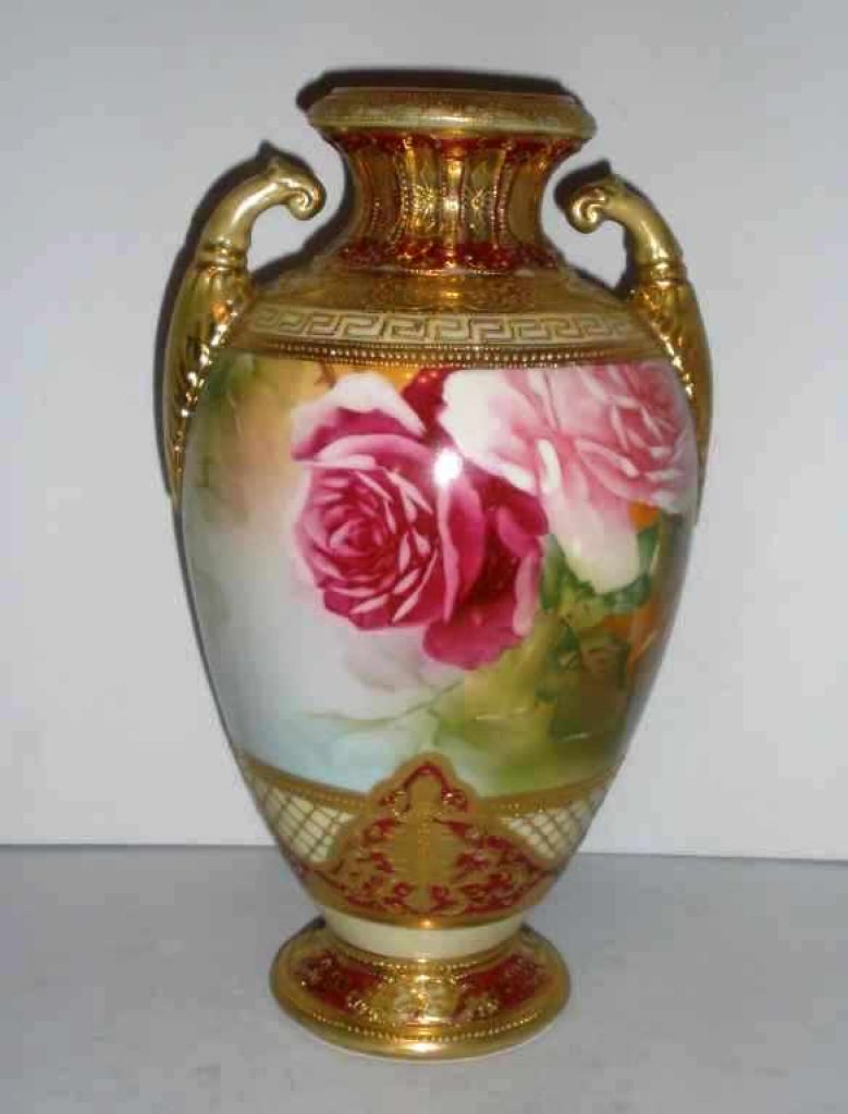 Nippon Vase Handled, Heavy Gold Raised Decoration, Pink Roses, Unsigned - 13 1/4" tall Nippon Vase Handled, Heavy Gold Raised Decoration, Pink Roses, Unsigned - 13 1/4" tall