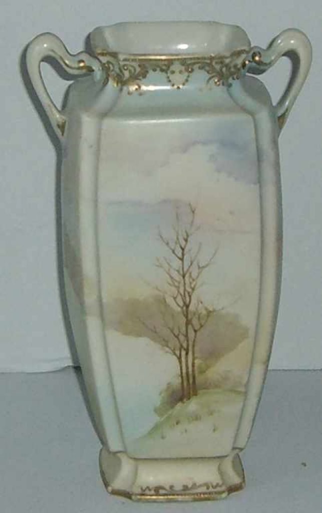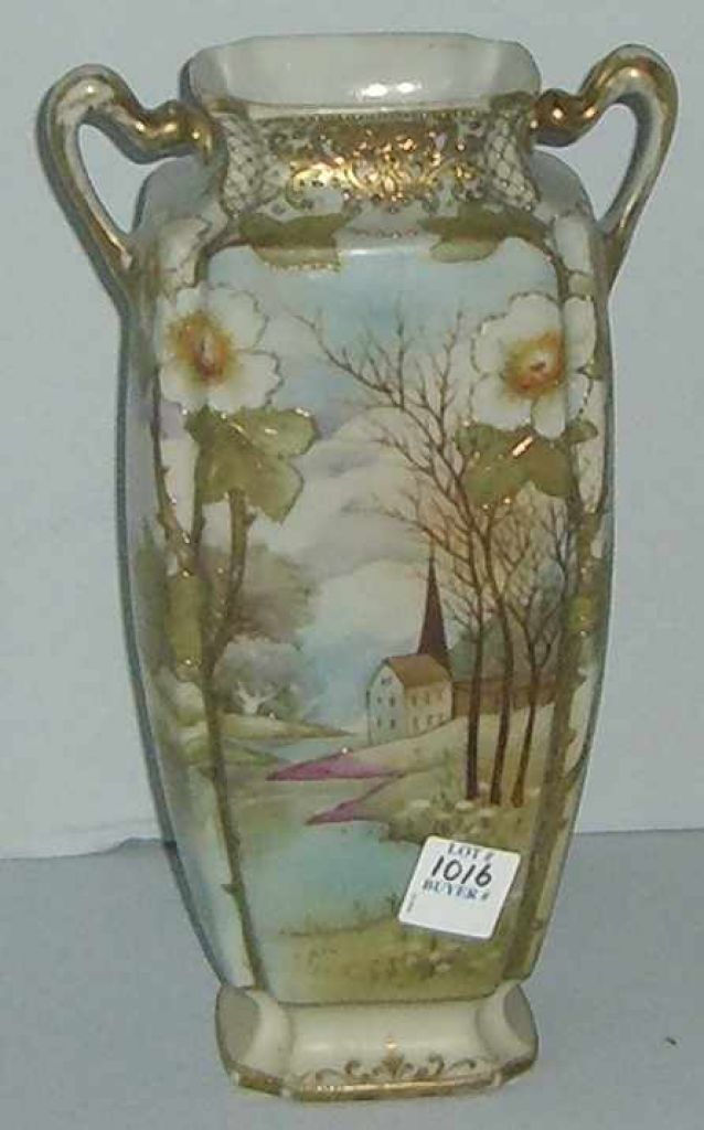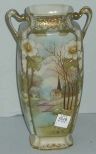Hand painted scenic Nippon double handled vase w/raised decoration and gold beading - 10 1/2" tall Hand painted scenic Nippon double handled vase w/raised decoration and gold beading - 10 1/2" tall