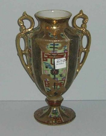 Bolted Urn w/Geometric and Raised Gold Decoration - 10 1/2" tall. Bolted Urn w/Geometric and Raised Gold Decoration - 10 1/2" tall.