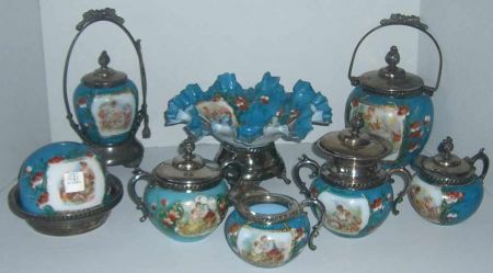 8 pc. set blue transfer w/portrait and floral decoration w/raised gold and enamel - consists of creamer, centerpiece bowl, covered sugar, pickle castor in gold frame, jam pot, butter dish, biscuit barrel, syrup. 8 pc. set blue transfer w/portrait and floral decoration w/raised gold and enamel - consists of creamer, centerpiece bowl, covered sugar, pickle castor in gold frame, jam pot, butter dish, biscuit barrel, syrup.