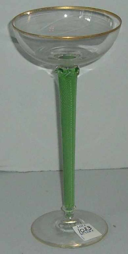 Green air twist stem champagne glass, clear bowl and foot, gold trim top - 10 3/4" tall. Green air twist stem champagne glass, clear bowl and foot, gold trim top - 10 3/4" tall.
