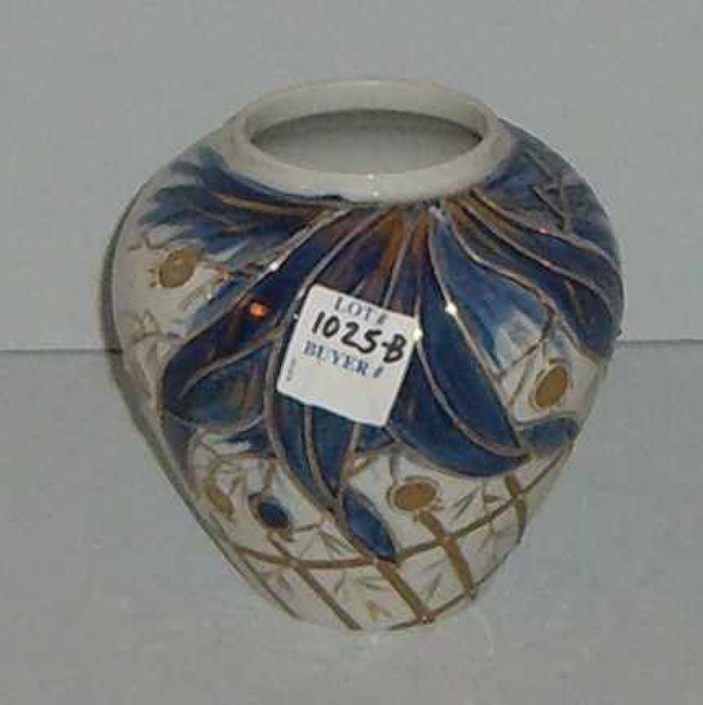 Unmarked RS Prussia Ginger Jar, Cover Missing, Cobalt in Color, Decorated in Heavy Gold Cross Patching - 4 1/4" tall, 14" around. Unmarked RS Prussia Ginger Jar, Cover Missing, Cobalt in Color, Decorated in Heavy Gold Cross Patching - 4 1/4" tall, 14" around.