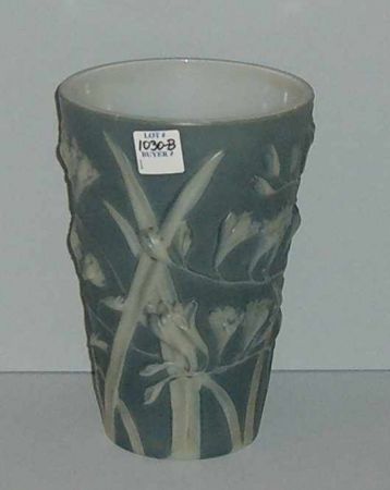 Phoenix Glass Vase, Blue Background w/Freesia Floral Decoration - 8 1/4" tall x 5 3/4" diameter. Phoenix Glass Vase, Blue Background w/Freesia Floral Decoration - 8 1/4" tall x 5 3/4" diameter.