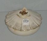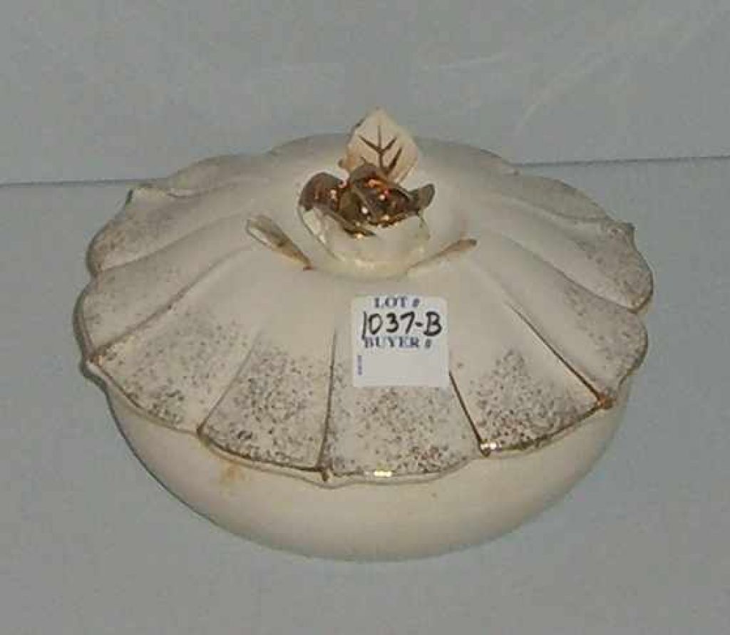 Dresser Box White Background w/Gold Gilt Decoration and Applied Gold Rose Handle and Leaves. 6 1/2" diameter x 2 1/2" tall Dresser Box White Background w/Gold Gilt Decoration and Applied Gold Rose Handle and Leaves. 6 1/2" diameter x 2 1/2" tall
