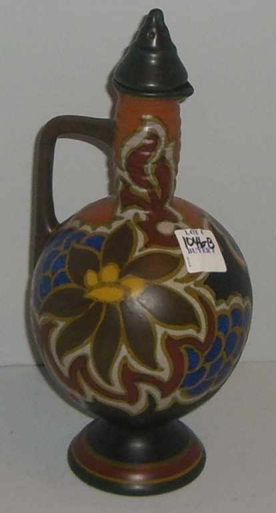 Gouda Nouveau Zuid-Holland Nadro Decanter, Circa 1920, Decorated w/Stylized Poinsettia - 10 1/2" tall x 4 1/2" wide Gouda Nouveau Zuid-Holland Nadro Decanter, Circa 1920, Decorated w/Stylized Poinsettia - 10 1/2" tall x 4 1/2" wide