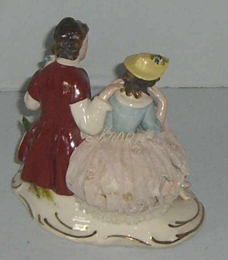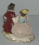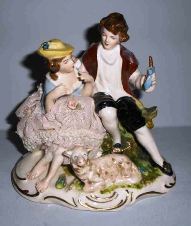 Dresden courtship figures man & woman with lamb - 5" tall. LADY'S DRESS HAS LACE MISSING. Dresden courtship figures man & woman with lamb - 5" tall. LADY'S DRESS HAS LACE MISSING.