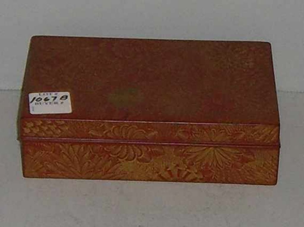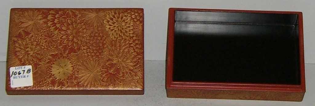 Lacquered Occupied Japan Box w/Stenciled Floral Decoration, Paper Sticker - 6 1/2" length x 4 1/4" width x 2" deep Lacquered Occupied Japan Box w/Stenciled Floral Decoration, Paper Sticker - 6 1/2" length x 4 1/4" width x 2" deep