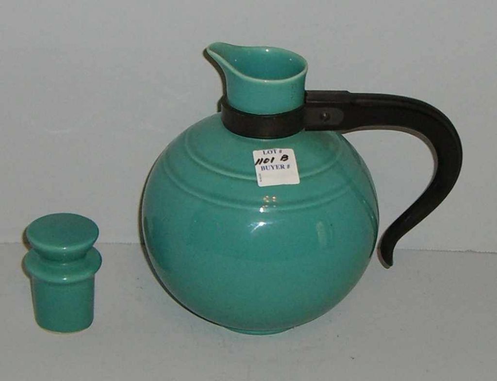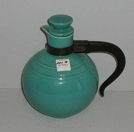 Turquoise Pottery Coffee Pot, Plastic Handle, Made in California. Turquoise Pottery Coffee Pot, Plastic Handle, Made in California.