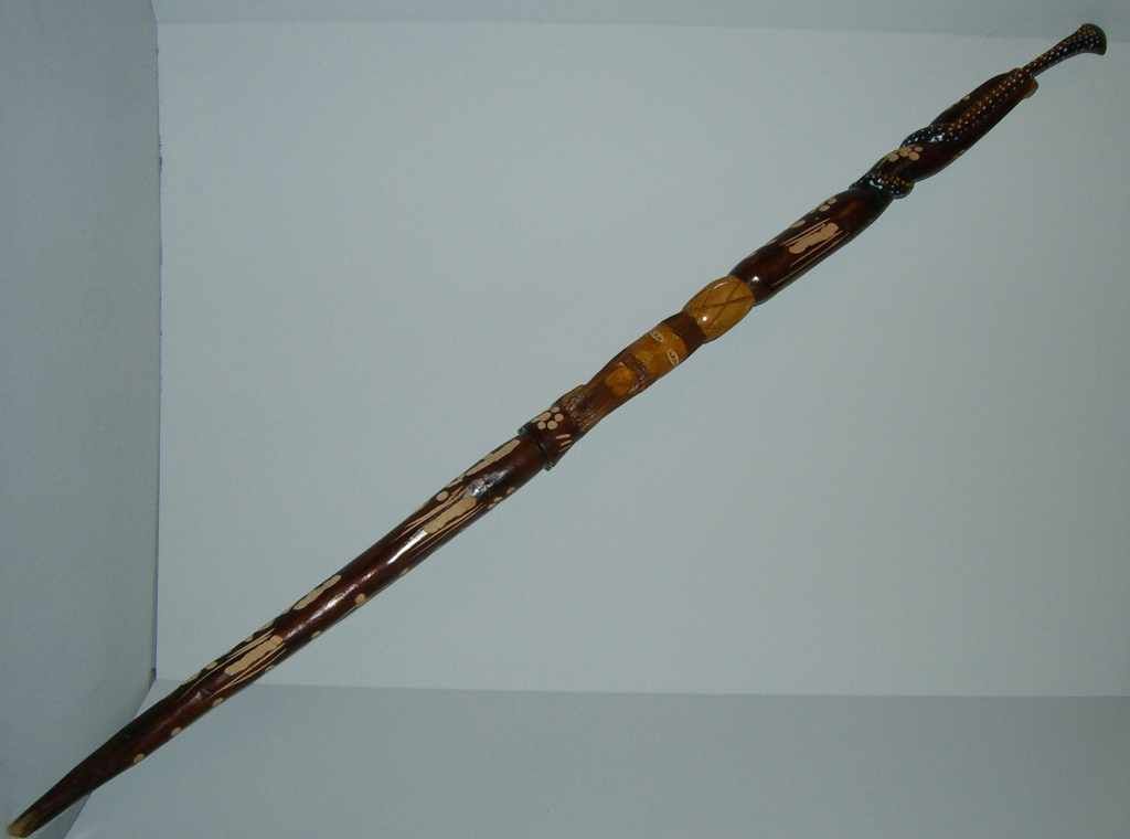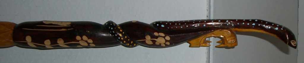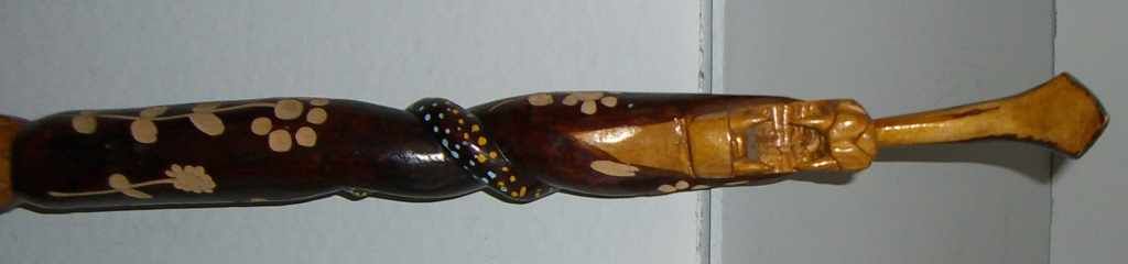 4426 Carved and Stained Double Serpent Walking Cane, "Iria Jamaica" on Side