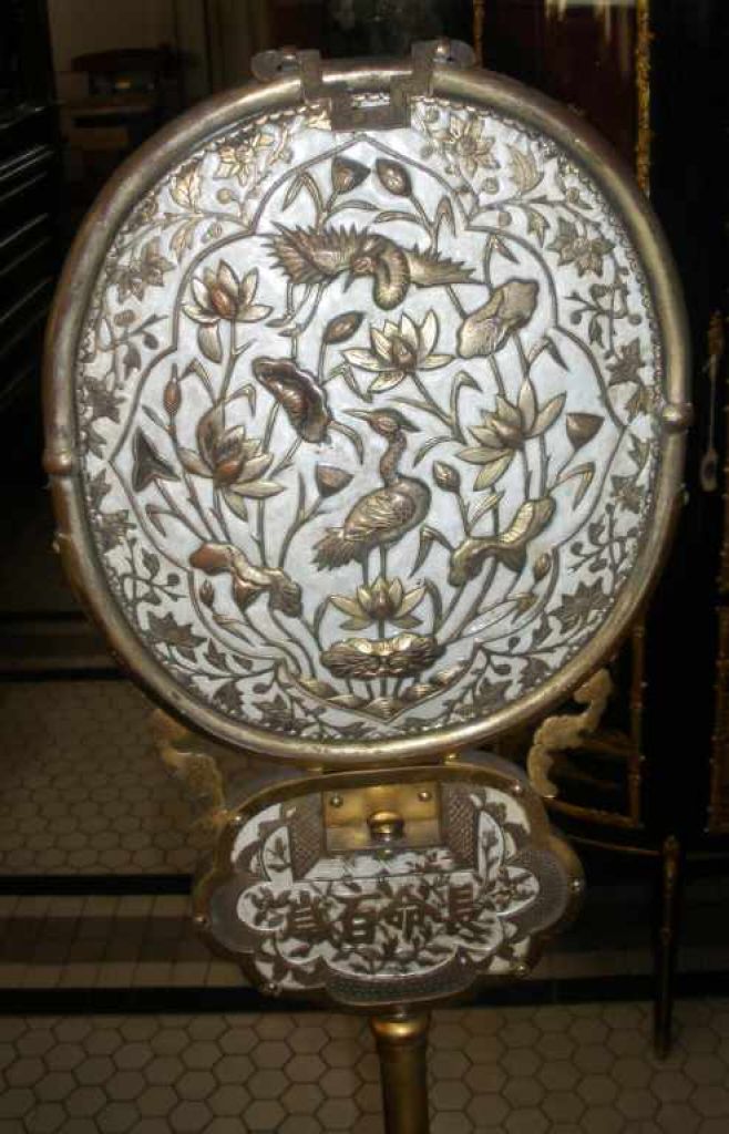 Japanese Decorated Adjustable Shaving Mirror, Birds and Floral Decoration, Japanese Lettering is "Long Life 100 Years" - 62" tall Japanese Decorated Adjustable Shaving Mirror, Birds and Floral Decoration, Japanese Lettering is "Long Life 100 Years" - 62" tall