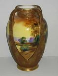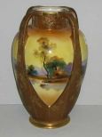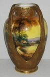 4 Handled Nippon Vase w/Scenic Panels and Overlay of Taupe and Heavy Gold Decoration - Marked Hand Painted Nippon "M" Within Wreath - 15" tall 4 Handled Nippon Vase w/Scenic Panels and Overlay of Taupe and Heavy Gold Decoration - Marked Hand Painted Nippon "M" Within Wreath - 15" tall