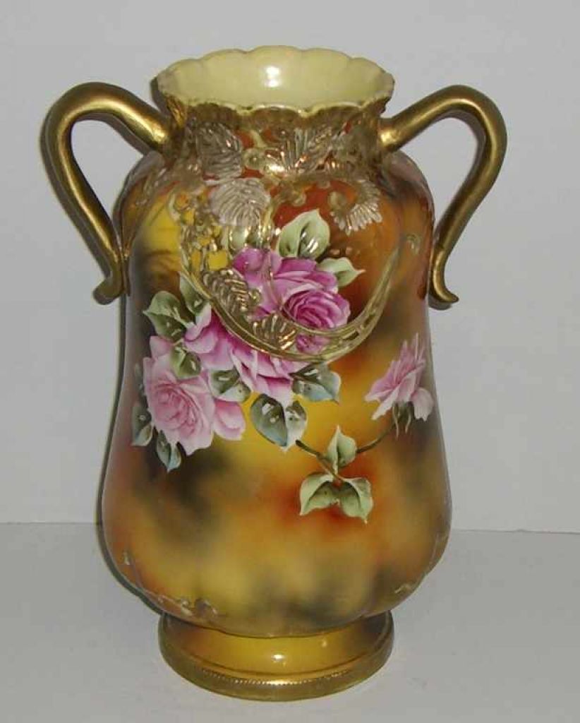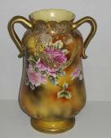 Nippon Vase Double Handled, Footed w/Roses - Marked Hand Painted Nippon "M" Within a Wreath - 13 1/4" tall Nippon Vase Double Handled, Footed w/Roses - Marked Hand Painted Nippon "M" Within a Wreath - 13 1/4" tall