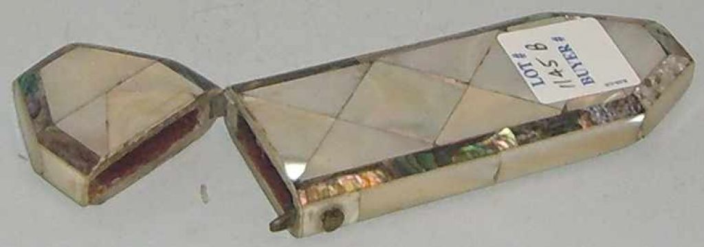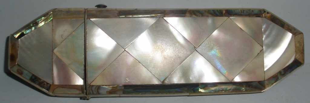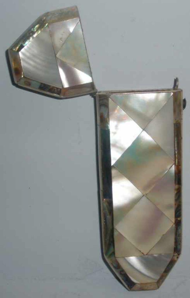 Mother of pearl long narrow card case with beveled corners & abalone burled trim - 2" wide by 5 3/4" tall Mother of pearl long narrow card case with beveled corners & abalone burled trim - 2" wide by 5 3/4" tall