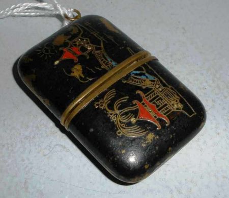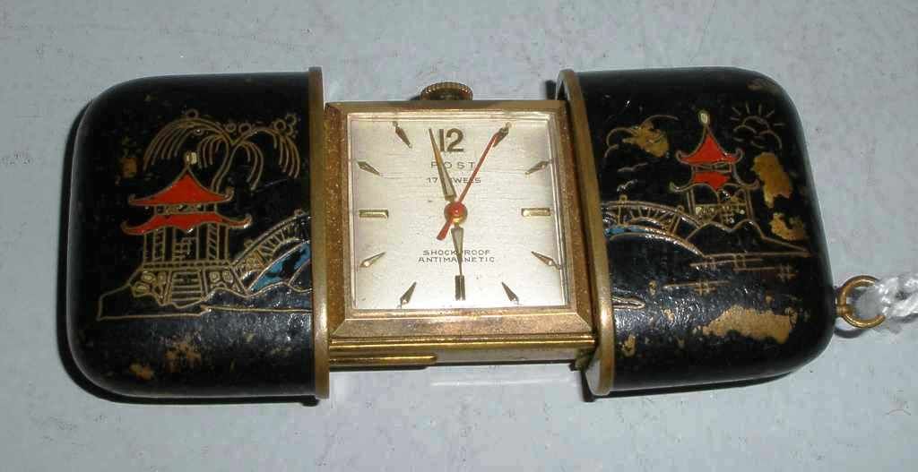 Ladies slide open purse watch with ebonized oriental decoration. Post Co. Canada. 17 jewels monogrammed. Ladies slide open purse watch with ebonized oriental decoration. Post Co. Canada. 17 jewels monogrammed.