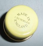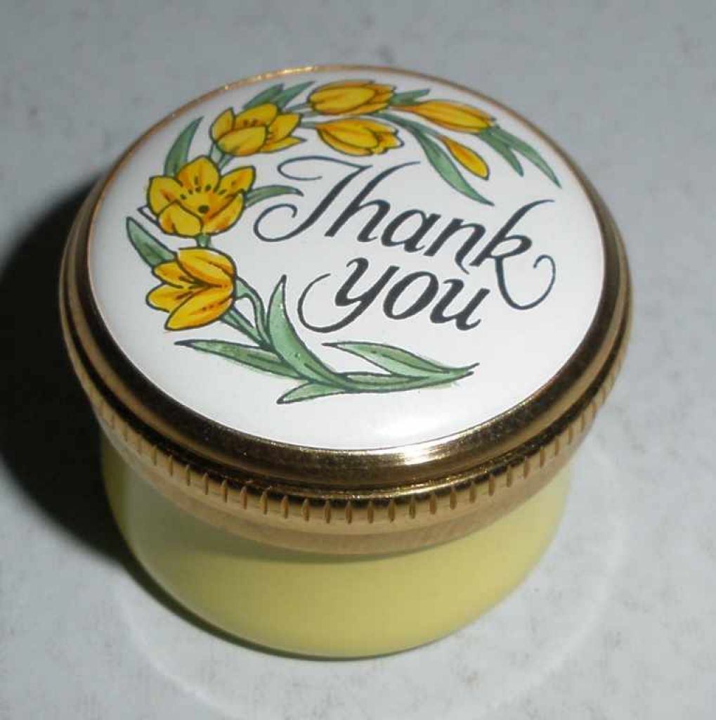 Crummles England small enameled pill box thank you on top. 7/8" diameter x 5/8" tall Crummles England small enameled pill box thank you on top. 7/8" diameter x 5/8" tall