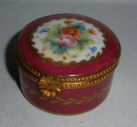 Small round Limoges covered hinged box rose colored with floral decorations. 1 7/8" diameter x 7/8" tall Small round Limoges covered hinged box rose colored with floral decorations. 1 7/8" diameter x 7/8" tall