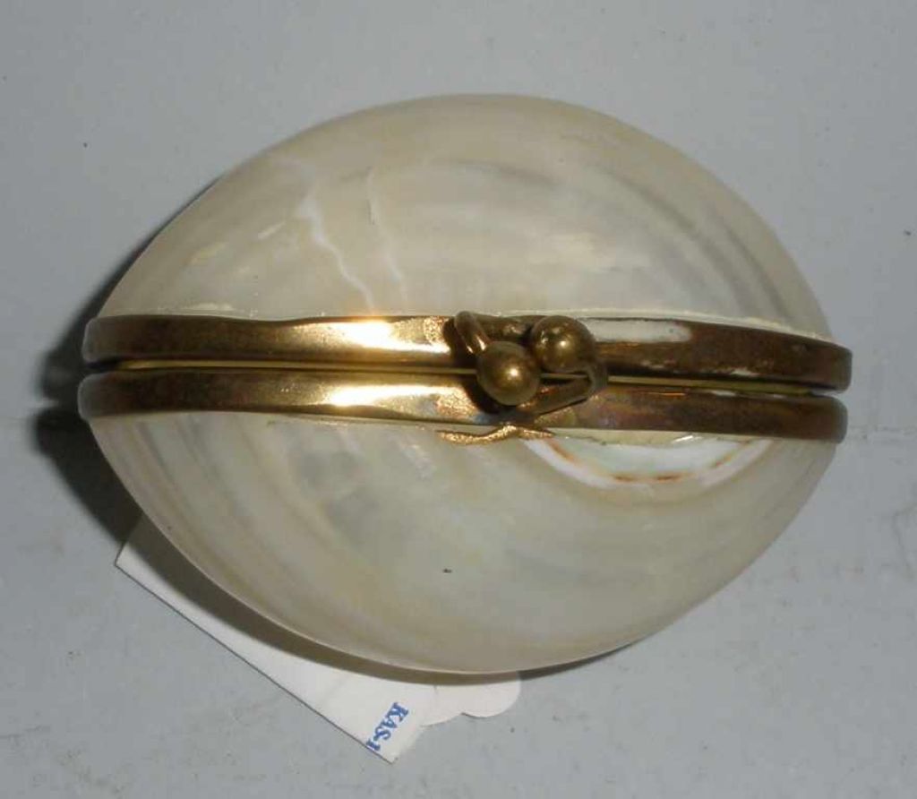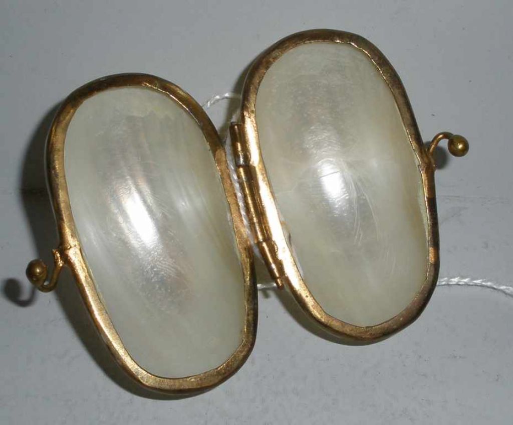 Oval pearlized shell hinged pill box with brass fittings. 1" width x 2" length x 1 1/2" height Oval pearlized shell hinged pill box with brass fittings. 1" width x 2" length x 1 1/2" height